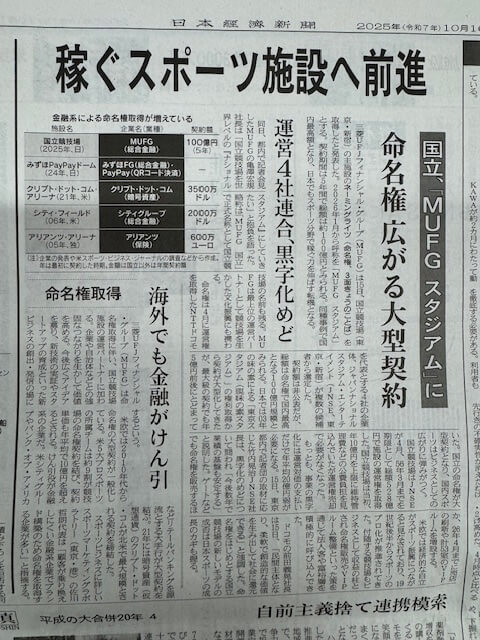 今朝の日経新聞の2面に大きく取り上げられた「MUFG スタジアム」(呼称、2026年1月から使用)。