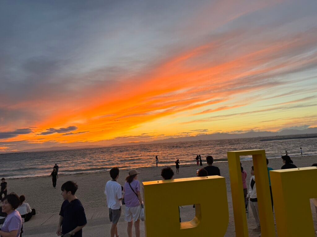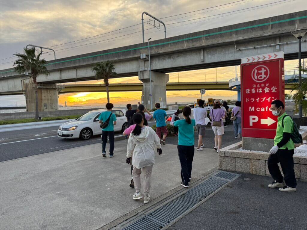 昨日(9/21)は、りんくうビーチのプロギングをしました。毎年この時期に行なっています。昨日の天気は雲は多かったものの晴れ渡ってちょうど良い風に吹かれてビーチクリーンを楽しみました。和ツィの所属している協会のメンバーも14名ほど参加してくれて総勢31名の大所帯のプロギングになりました。まるは食堂の駐車場を借りてそこから出発してりんくうビーチに入っていきました。その頃の時間が17:50ごろで日没の時間となり、雲が赤く染まってまさにサンセットビーチそのものとなりました。りんくうビーチからの夕焼けを見たのは久しぶりでした。ゴミを拾うのを忘れてシャッターを何度も押していました。